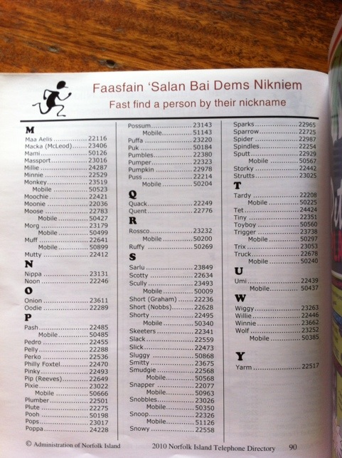 If you want to call someone in Norfolk Island but only know them by their nickname then … “no worries mate” … there’s a section in the phone book for that.